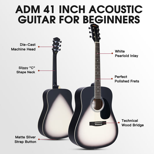 ADM Dreadnought Acoustic Guitar Kit with Free Lesson for Beginner Adult Teen Full Size Acustica Guitarra Starter Bundle Set w/Bag Strap Tuner Capo Pickguard Music Stand Right Hand(Black 1, 41 Inch)